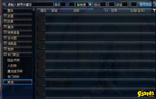 按职业和装备类型查找不必细说,需要注意称号属于首饰一栏,但魔盒开出的意志类称号和设计图无法上架拍卖行;装备品级 整体 指所有类型,唯一 指粉色装备,玩家可先到装备辞典了解各装备属性再选择购买装备。